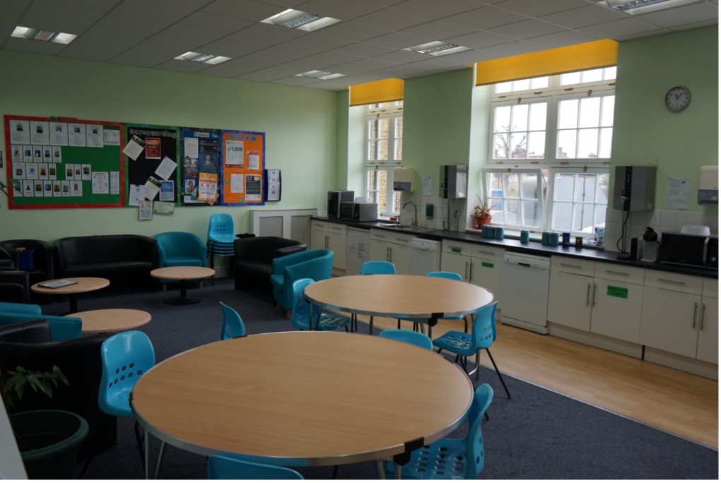Staff room with screen, fridge, tea/coffee making facilities, microwave and dishwasher.