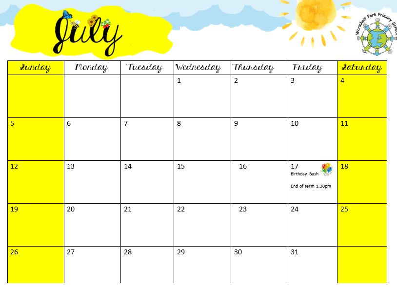 • 17th July – End of Term. School closes at 1.30pm