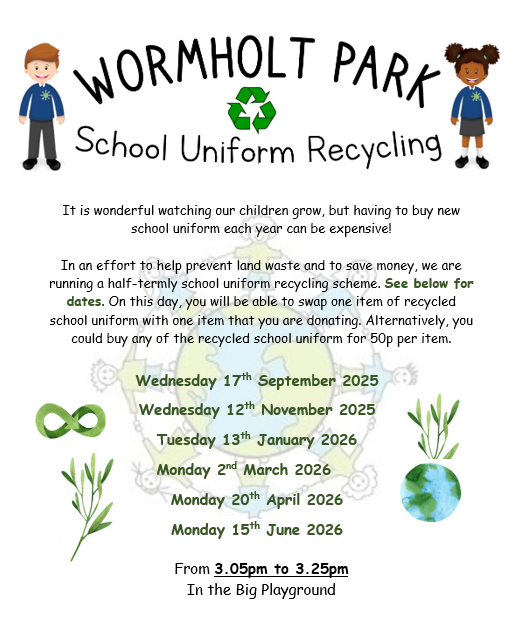 In an effort to help prevent land waste and to save money, we are running a half-termly school uniform recycling scheme. See below for dates. On this day, you will be able to swap one item of recycled school uniform with one item that you are donating. Alternatively, you could buy any of the recycled school uniform for 50p per item. All donated items are washed before being offered during the next sale.